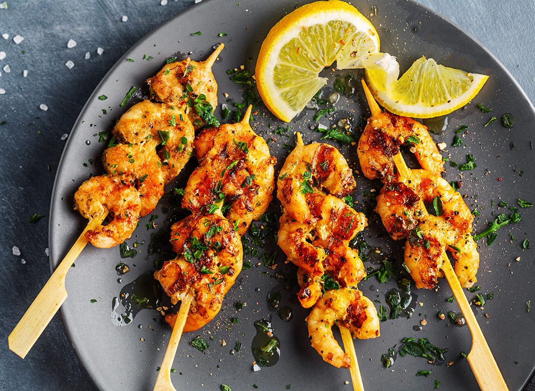 4. Remove shrimp from grill and brush with lemon butter again. Top with parsley.